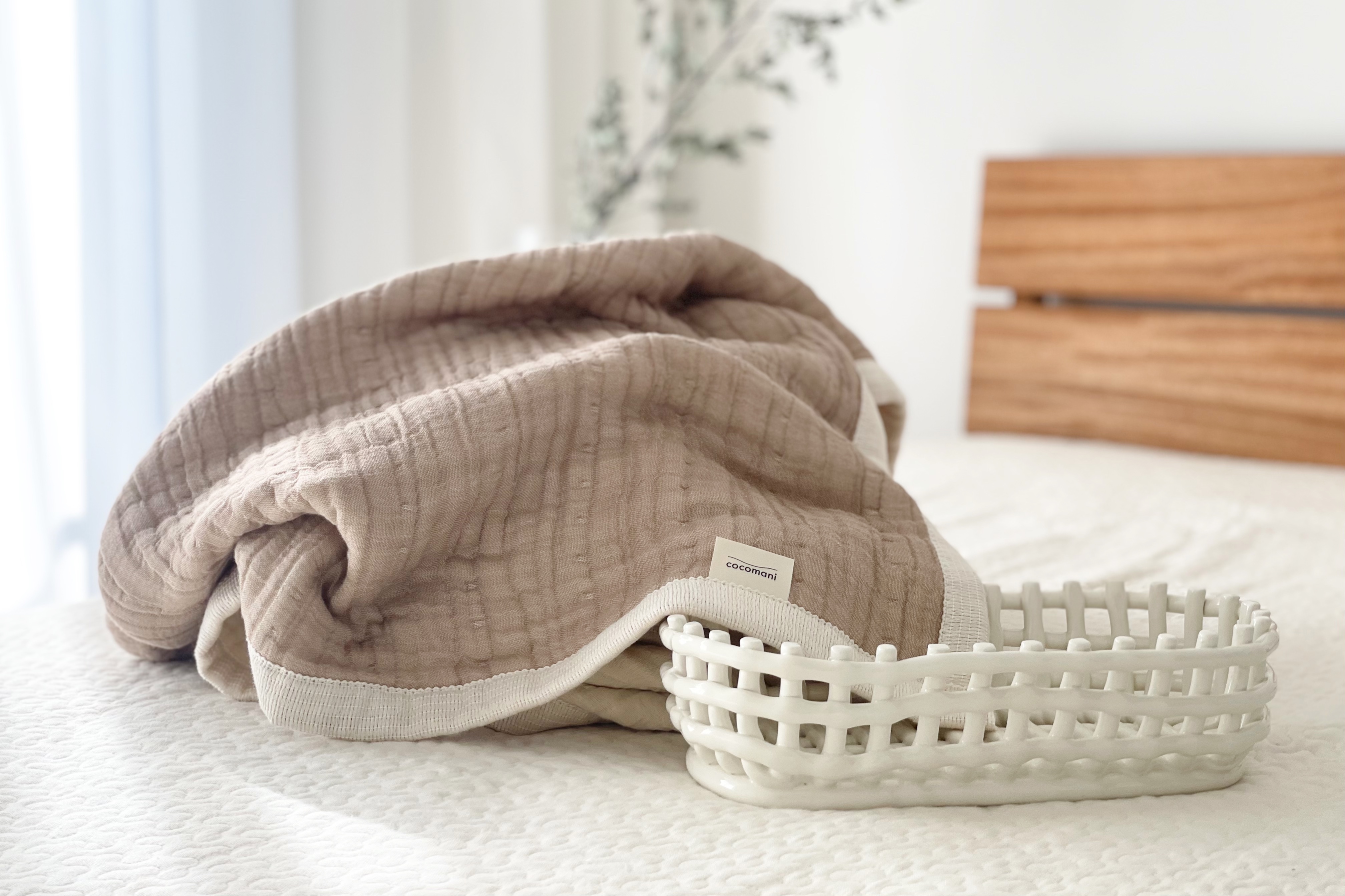 生地の間に空気を含んでふんわり優しく織り上げた綿100%の8重ガーゼケット。