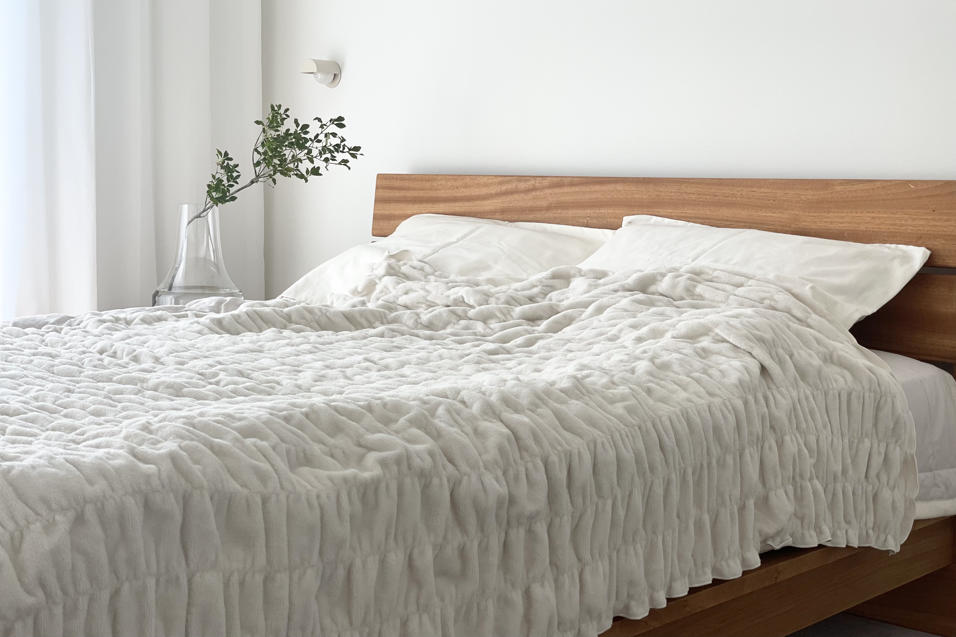 軽やかで柔らかな感触と、余計な装飾をせず自然なくしゅくしゅとした風合いによって、やさしく包み込まれるような心地よさを感じて頂ける毛布は、肌に触れる毛羽に保湿性・吸湿性を併せ持つオーガニックコットンを採用しています。綿の優しい肌触りが心地よい眠りをサポートしてくれます。