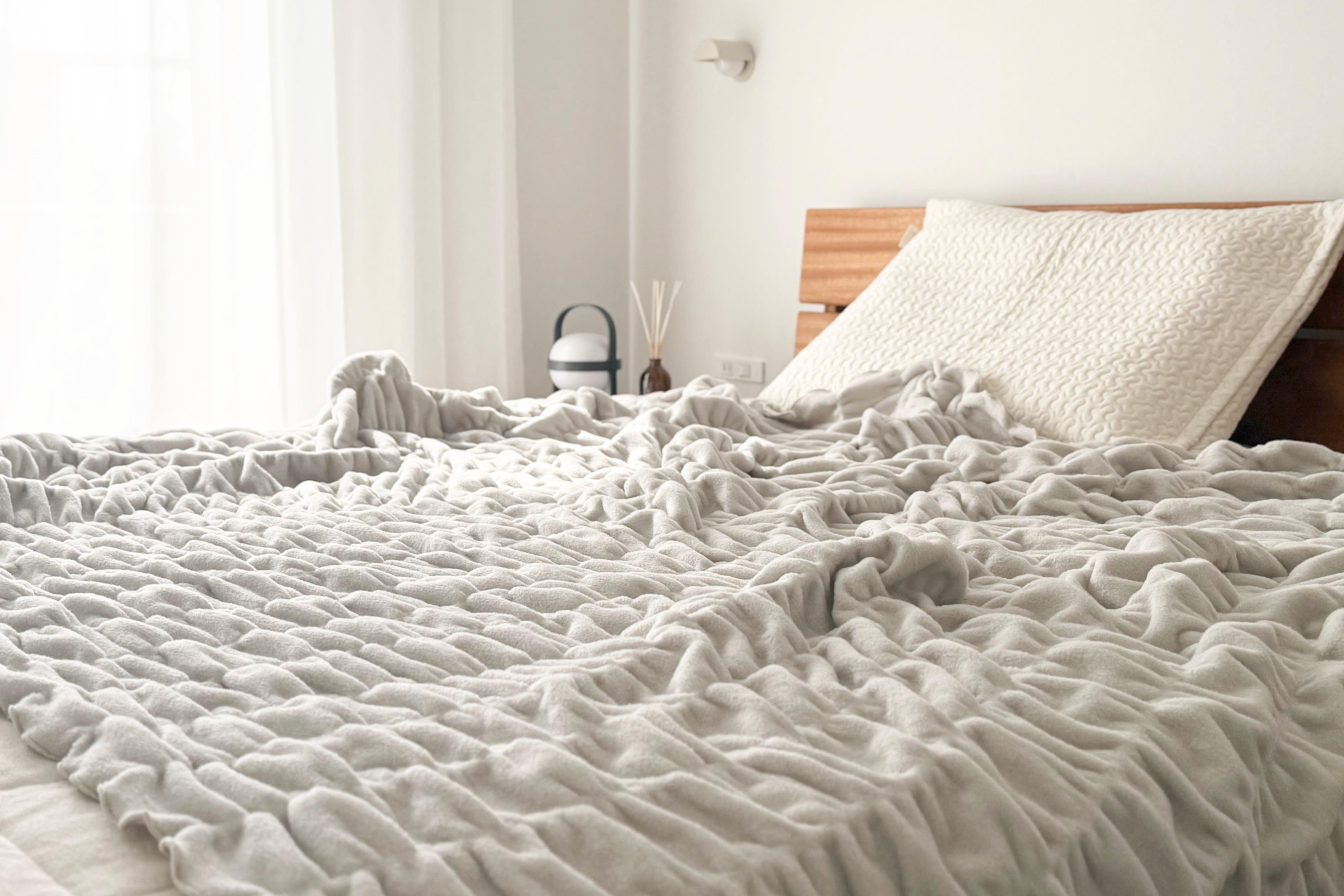 軽やかで柔らかな感触と、余計な装飾をせず自然なくしゅくしゅとした風合いによって、やさしく包み込まれるような心地よさを感じて頂ける毛布は、肌に触れる毛羽に保湿性・吸湿性を併せ持つオーガニックコットンを採用しています。綿の優しい肌触りが心地よい眠りをサポートしてくれます。